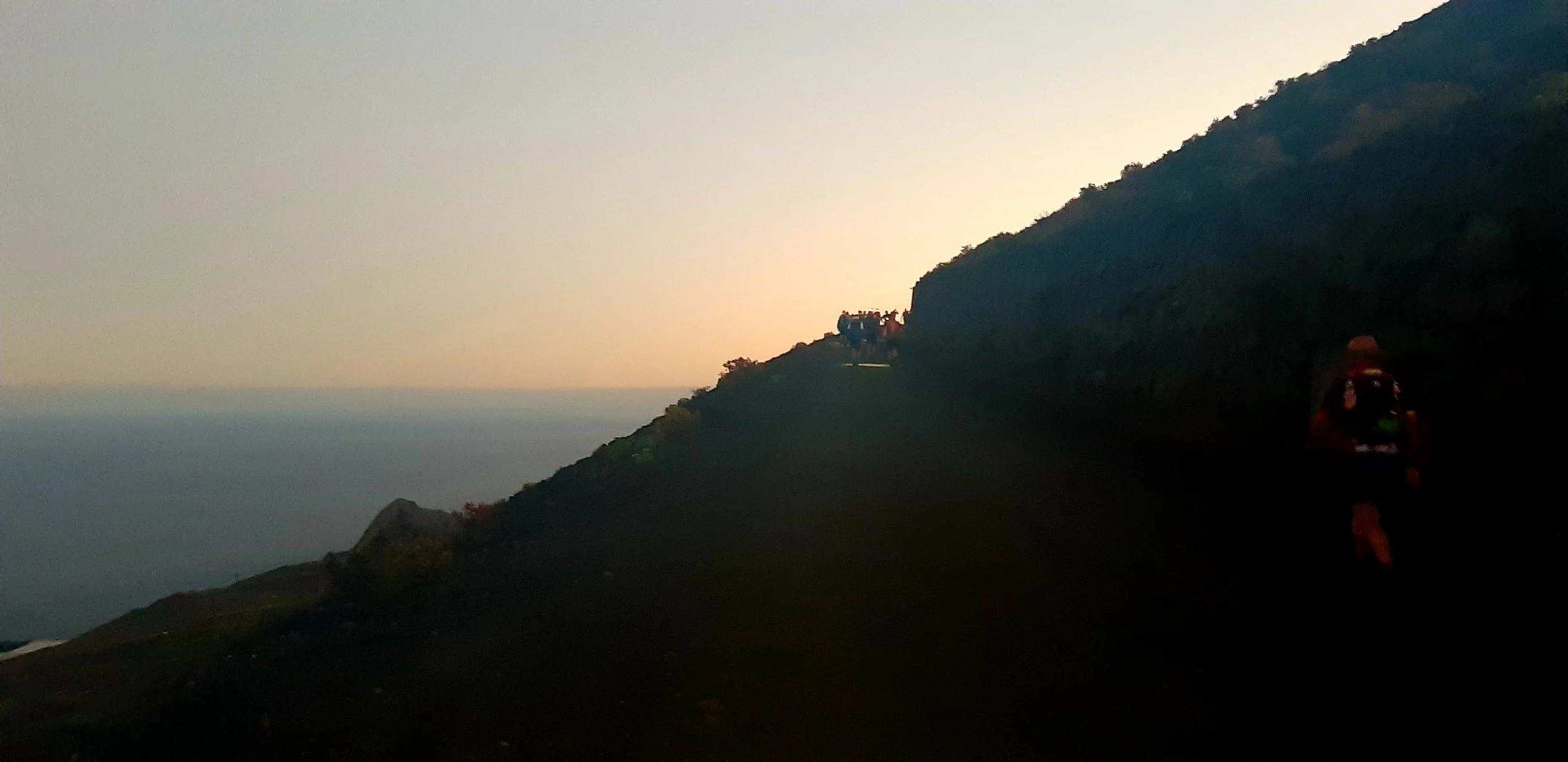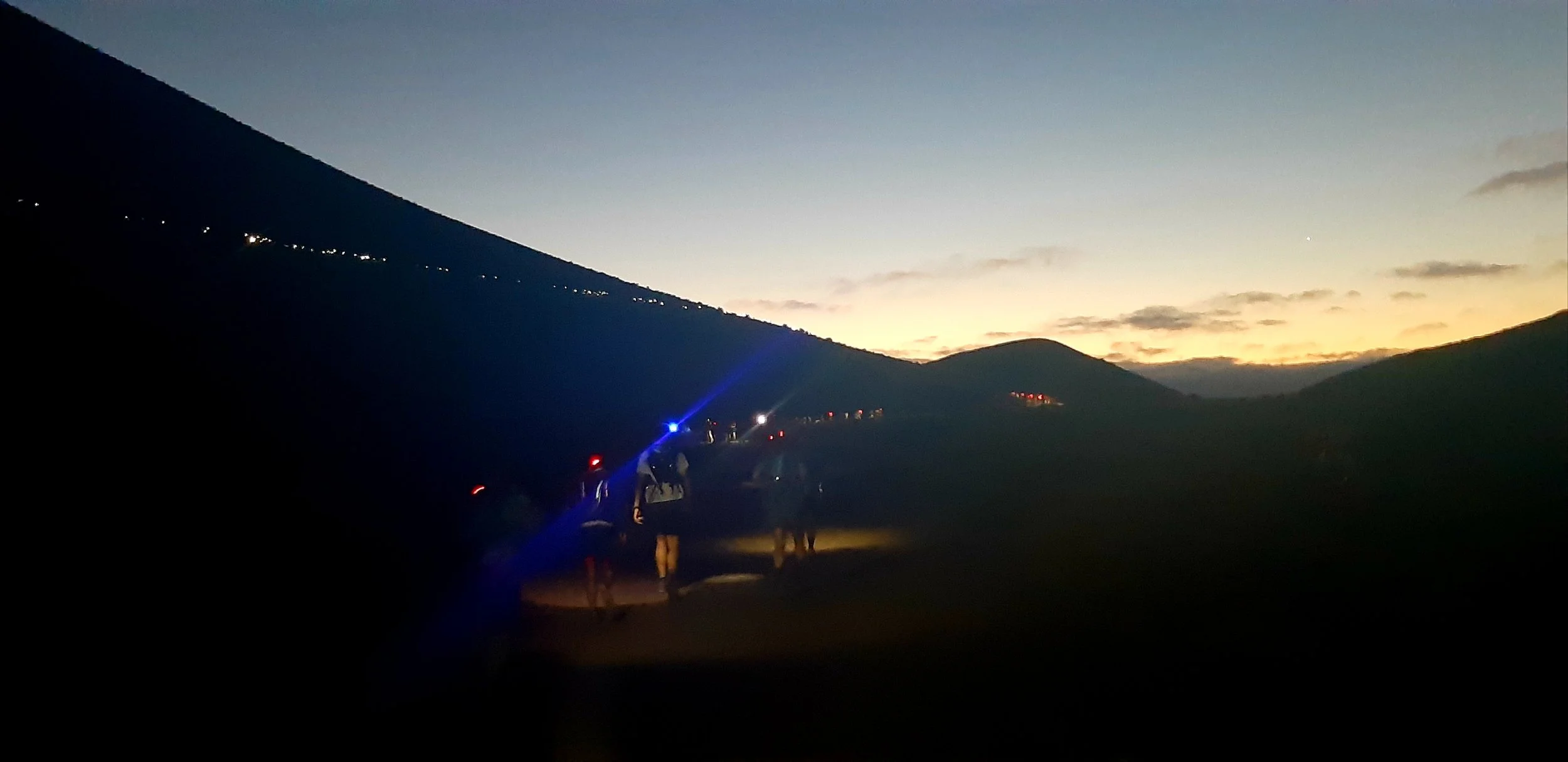 After around 2km of road, some of which we ran, we had to queue to get off road and start the hike up the sand covered 2 man wide trail. The black sand glistened in the light of the head torches as we snaked our way up the mountain until the path widened and became more runnable for a while. Quite amazingly, people were out on the mountain side before sunrise, greeting us with calls of ‘Animo’ and ‘Campeones’.