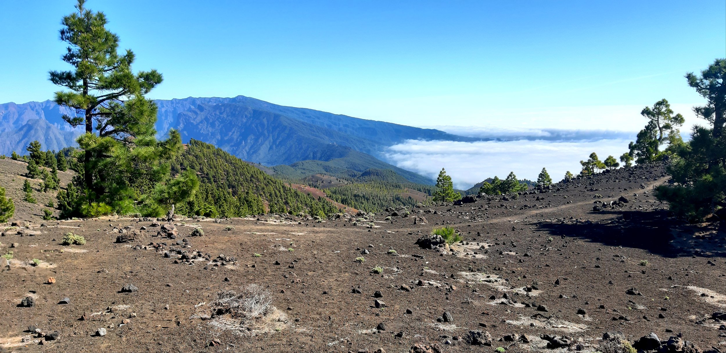 This is the hill that finally broke me, although luckily it was the last one before the relatively easy descent into Refugio el Pilar (the starting point for the marathon), where my Transvulancia experience would come to an end. 25km in 5 hours 23 mins. This climb finished at the top of the peak in the middle of the picture just to the left of the tree and the last picture was taken near the top looking down at the aid point, which is where the first picture was taken.